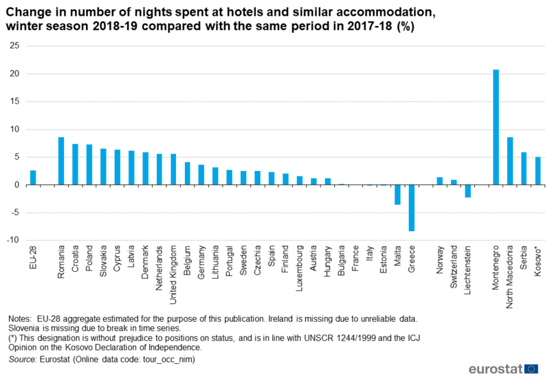 Jeśli zaś chodzi o cele podróży obywateli UE to najpopularniejsza w zimowym sezonie 2018/2019 była Hiszpania (20% noclegów), gonią ją Włochy i Wielka Brytania (po 12%), Austria (10%), Niemcy oraz Francja (po 9%) co łącznie daje 72% obywateli Unii wyjeżdżających zimą za granicę. Polska w zimie nie może liczyć na popularność wśród obywateli UE.