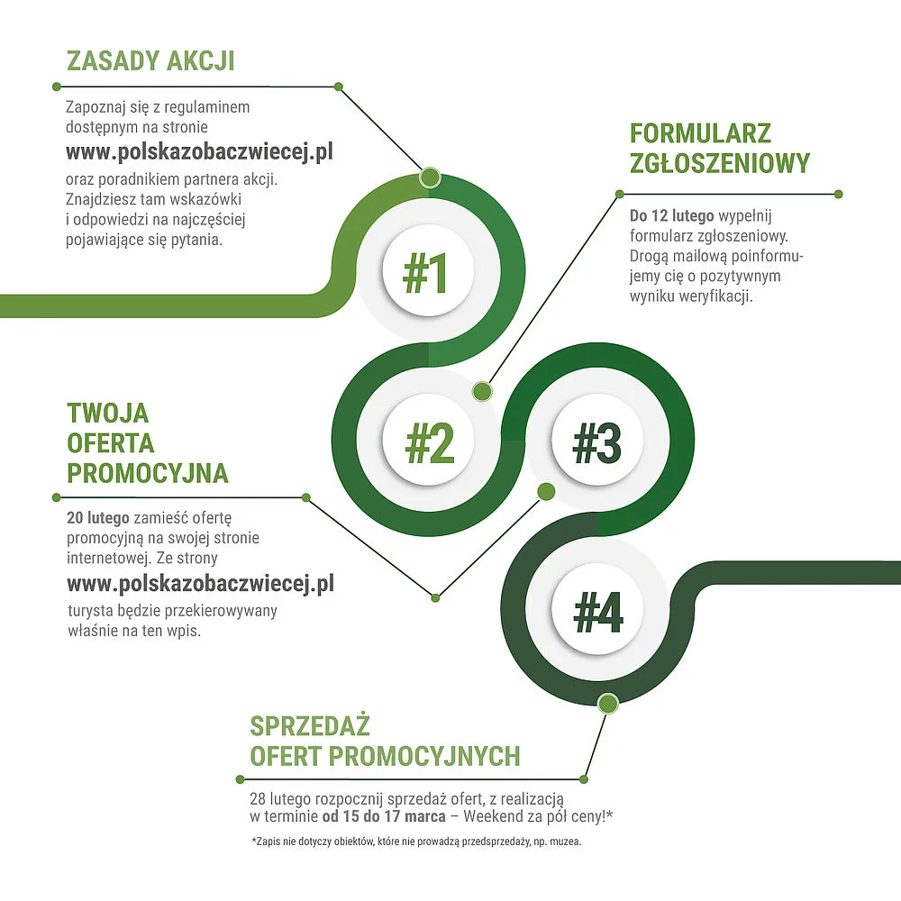 Na wiosnę, od piątku do niedzieli, 15 - 17 marca 2019r., usługi turystyczne będą tańsze. Klienci będą mogli je kupować wcześniej, od 28 lutego. Hotelarze, gestorzy atrakcji turystycznych, restauratorzy, organizacje i instytucje związane z obsługą ruchu turystycznego, mogą składać oferty udziału w szóstej edycji akcji "POLSKA ZOBACZ WIĘCEJ - WEEKEND ZA PÓŁ CENY" do 12 lutego.
